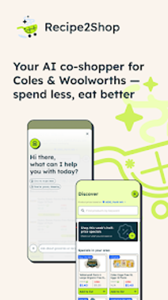 Recipe2Shop, Android platformunda sunulan bir yaşam tarzı uygulamasıdır. Bu uygulama, Coles ve Woolworths süpermarketleri arasında fiyat karşılaştırması yaparak kullanıcıların en uygun fiyatlı ürünleri bulmasına yardımcı olur. Kullanıcılar, benzer ürünler arasında fiyat farklarını görebilir ve hangi süpermarkette hangi ürünün daha ucuz olduğunu öğrenebilirler. Ayrıca, farklı markalar, paket boyutları veya tatlar gibi alternatif ürün önerileri sunarak tasarruf etmeyi hedefler.